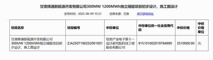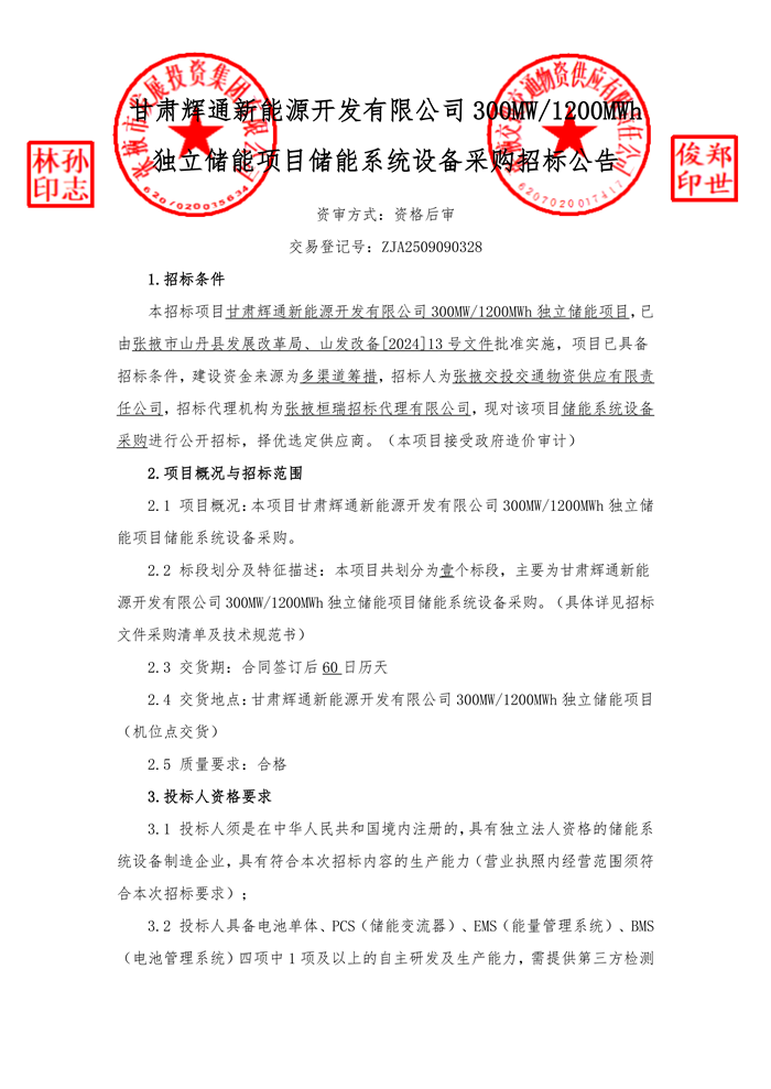 储能中国网获悉,9月23日,甘肃辉通新能源开发有限公司发布300MW/ 1200MWh独立储能项目储能系统设备采购招标公告。招标人为张掖交投交通物资供应有限责任公司(由国有控股的张掖交通建设投资有限责任公司全资持股)。 招标公告提出,投标人应具有至少一个单体项目容量≥100MWh的投运业绩或具有自2022 年1月1日至投标截止日(以合同签订时间为准)累计不低于1000MWh的磷酸铁锂电化学储能系统集成设备合同业绩(至少包含电池预制舱、PCS)。另外要求,电池生产日期不得早于项目实际供货日期超过3个月。 据悉,该项目新建1座规模为300MW/1200MWh独立储能电站,共设置60套5MWh集装箱式电池舱(磷酸铁锂电池舱),60套PCS升压一体舱;配套建设1座330KV升压站,主变规模1×360MVA,储能单元所发电力经35k (略) 送入配套建设的330kV升压站,新 (略) 0.52km,线路起点为本项目330kV升压站,终点为330kV建业变本次扩建330kV出线间隔,全线 (略) 架设。本项目总投资*.*元,其中环保投资*元,占总投资的0.08%。 项目设计中标单位为:信息产业电子第十一设计研究院科技工程股份有限公司 设备采购招标公告原文如下: |
