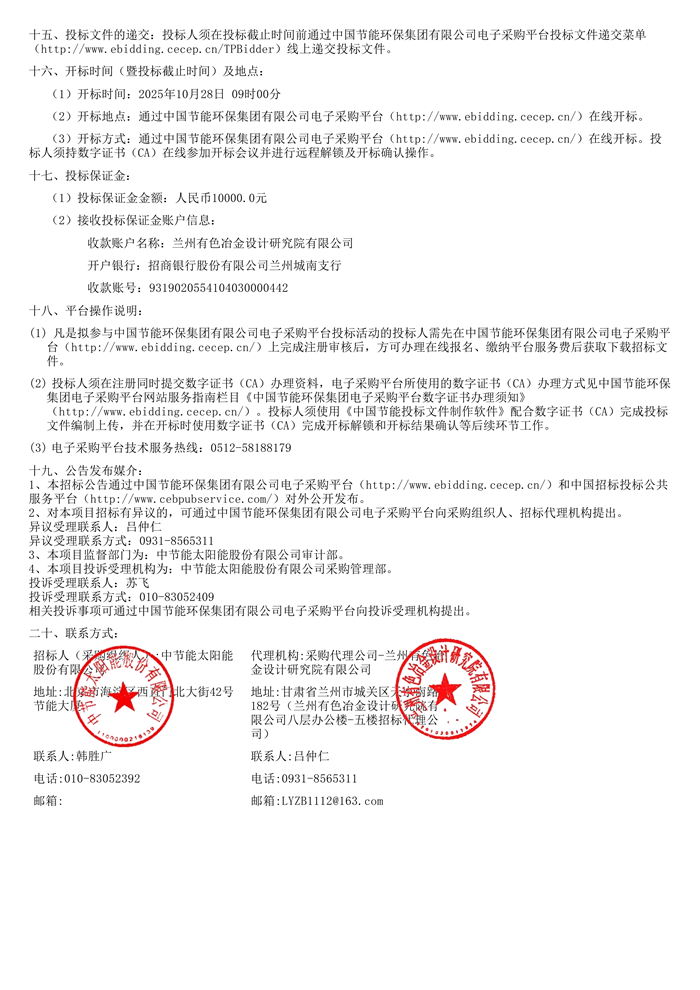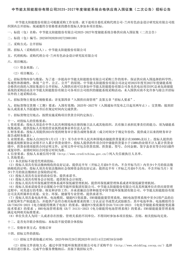 储能中国网获悉,9月29日,中节能太阳能股份有限公司发布2025-2027年度储能系统合格供应商入围征集公开招标(二次公告)招标公告。其中,公告表示,入围供应商可以参加中节能太阳能股份有限公司各光伏电站项目EPC总承包商储能系统的采购活动及中节能太阳能股份有限公司各项目公司组织的储能系统采购活动。入围有效期2025年-2027年。 业绩要求表示,投标人自2022年1月1日境内储能供货量累计在300MWh及以上。投标人提供的储能系统框架协议业绩不计入累计供货业绩中,投标人提供的单项合同中储能供货量小于15MWh的业绩不计入累计供货业绩中。 招标文件获取截止时间:2025年09月29日到2025年10月14日。 招标公告原文如下: