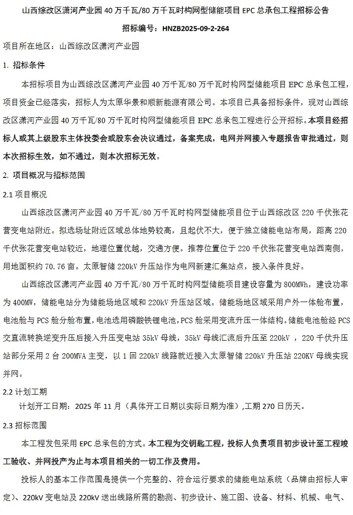 储能中国网获悉,近日,太原华景和顺新能源有限公司发布山西综改区潇河产业园400MW/800MWh构网型储能项目EPC总承包招标公告。招标人为太原华景和顺新能源有限公司。 山西综改区潇河产业园400MW/800MWh构网型储能项目建设容量为800MWh,建设功率为400MW,储能电站分为储能场地区域和220kV升压站区域。储能场地区域采用户外一体舱布置电池舱与PCS舱分舱布置,电池选用磷酸铁锂电池,PCS舱采用变流升压一体结构。储能电池舱经PCS交直流转换逆变升压后接入升压变电站35kV母线,35kV母线汇流后升压至220kV,220千伏升压站部分采用2台200MVA主变,以1回220kV线路就近接入太原智储220kV升压站220KV母线实现并网。 项目计划开工日期:2025年11月(具体开工日期以实际日期为准),工期270日历天。 招标公告原文如下: