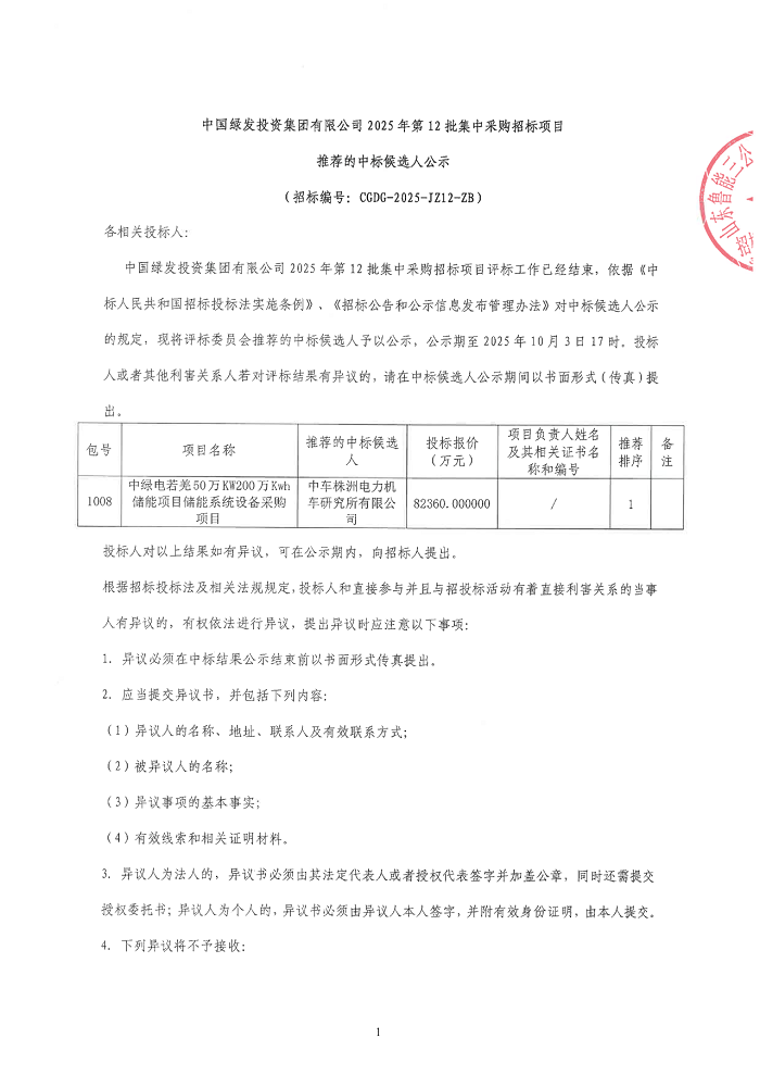 储能中国网获悉,日前,中国绿发投资集团有限公司发布中绿电若羌50万KW/200万KWh储能项目储能系统设备采购项目推荐的中标候选人公示。公示显示,中车株洲电力机车研究所有限公司以投标报价82360万元(折合单价0.4118元/Wh)预中标。 中标候选人公示如下: