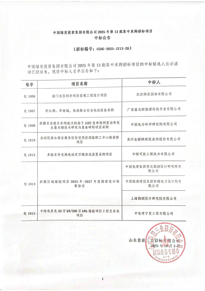 储能中国网获悉,10月3日,中国绿发投资集团有限公司发布2025年第13批集中采购招标项目中标公告。其中,中标公告显示,包1015—中绿电若羌50万kW/200万kWh储能项目工程总承包项目中标人为中电建宁夏工程有限公司。 根据招标公告,该项目位于若羌县东南部,距若羌县直线距离约13.9km,海拔高程约1102m。本工程位于冲洪积倾斜平原,地势南高北低,场地地形较平坦开阔。本项目建设50万kW/200万kWh储能区、1座220kV升压汇集站及1条2km长送出线路,接入中绿电若羌南220kV升压汇集站,送出线路采用LGJ-2×630型导线。 招标范围:完成本项目50万kW/200万kWh储能区和1座220KV升压汇集站、送出线路、对侧间隔及其他附属设施的勘察设计、设备材料采购(不含储能系统设备、主变、GIS)、建筑、安装、施工、培训、性能试验、调试、试运行、验收、投产、移交等全过程工作。 计划工期:项目计划开工日期2025年10月,计划完工日期2026年1月30日。具体以实际通知为准。 中标相关公告如下: