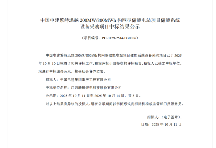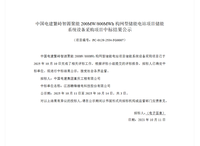 储能中国网获悉,10月11日,中国电建集团重庆工程有限公司发布繁峙智源聚能200MW/800MWh构网型储能电站项目、繁峙迅越200MW/800MWh构网型储能电站项目储能系统设备采购中标结果公示。两个项目中标单位都为江西赣锋锂电科技股份有限公司,中标规模合计400MW/1600MWh储能系统设备。 根据中国电建发布的2025年1月至7月主要经营情况公告,繁峙迅越和繁峙智源聚能为7月新签EPC总包项目。公告显示, 1、繁峙迅越200MW/800MWh构网型储能电站EPC总承包合同,项目金额6.64亿元; 2、繁峙智源聚能200MW/800MWh构网型储能电站EPC总承包合同,项目金额6.54亿元。 两项目中标结果公示原文如下: