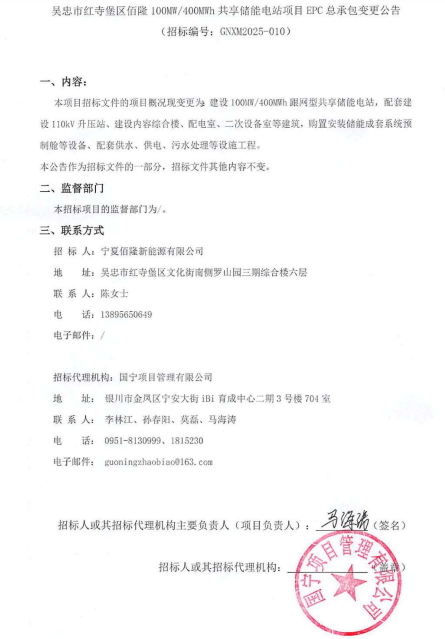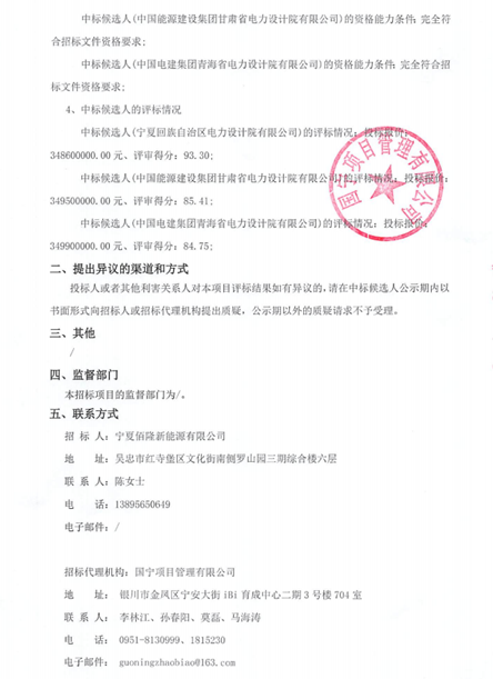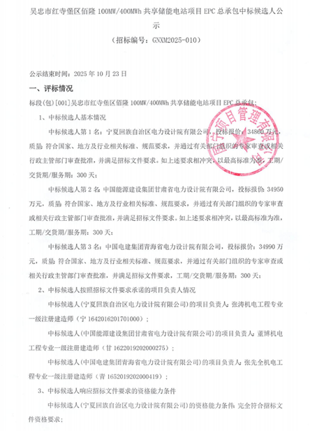 储能中国网获悉,10月20日,吴忠市红寺堡区佰隆100MW/400MWh共享储能电站项目EPC总承包中标候选人公示。公示显示,宁夏回族自治区电力设计院有限公司以投标报价34860万元(折合单价0.872元/Wh)预中标。 中标候选人情况详情为: 中标候选人第1名:宁夏回族自治区电力设计院有限公司,投标报价34860万元,折合单价0.872元/Wh; 中标候选人第2名:中国能源建设集团甘肃省电力设计院有限公司,投标报价34950万元,折合单价0.874元/Wh; 中标候选人第3名:中国电建集团青海省电力设计院有限公司,投标报价34990万元,折合单价0.875元/Wh。 根据招标公告显示,项目招标人为宗夏佰隆新能源有限公司,建设地点在宁夏回族自治区,吴忠市,红寺堡区。 本次项目建设100MW/400MWh跟网型共享储能电站,配套建设110kV升压站、建设内容综合楼、配电室、二次设备室等建筑,购置安装储能成套系统预制舱等设备、配套供水、供电、污水处理等设施工程。 原公告如下: