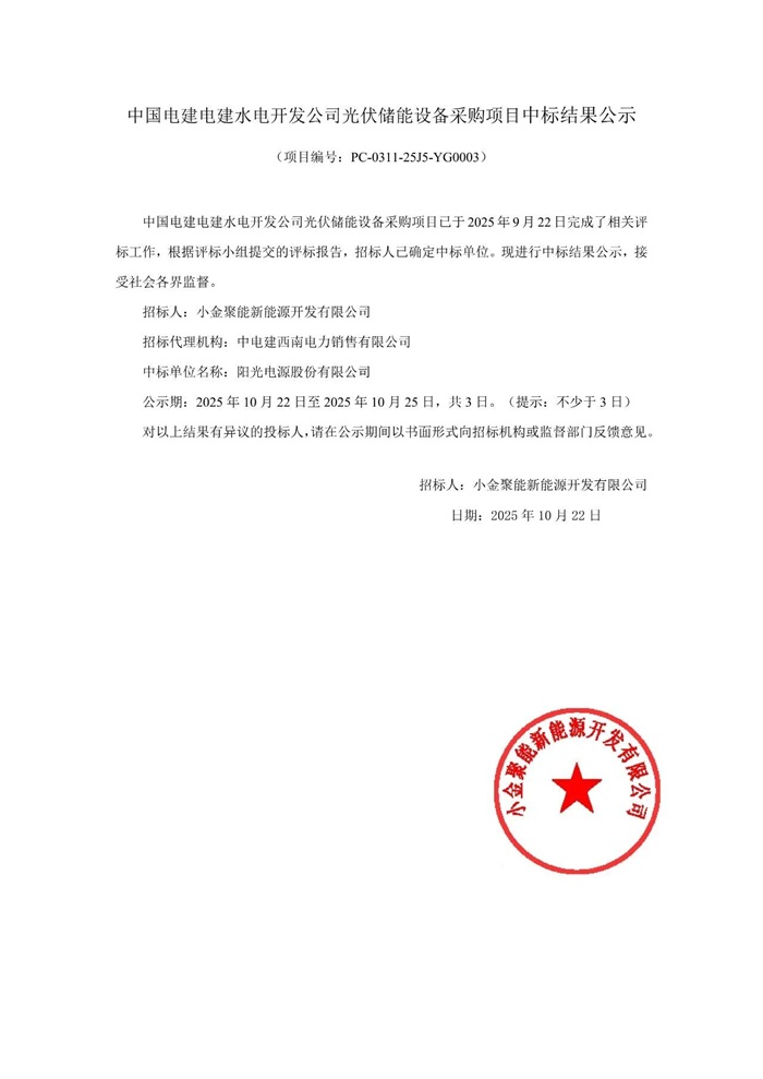 储能中国网获悉,10月22日,中国电建电建水电开发公司光伏储能设备采购项目中标结果公示,中标单位为阳光电源股份有限公司。 根据此前公布中标候选人公示,第一中标候选人:阳光电源投标报价21422500元,折合单价0.669元/Wh;第二中标候选人:江苏天合储能有限公司,投标报价为19520000元,折合单价0.61元/Wh。 该项目位于四川省阿坝州小金县境内,按光伏装机容量的10%配置构网型储能系统,容量为16MW/32MWh。本项目已于2025年6月初开工建设,初步计划 2025年12月31日全容量并网发电。 原文如下: