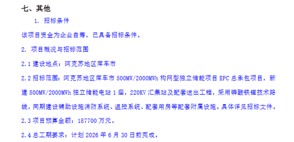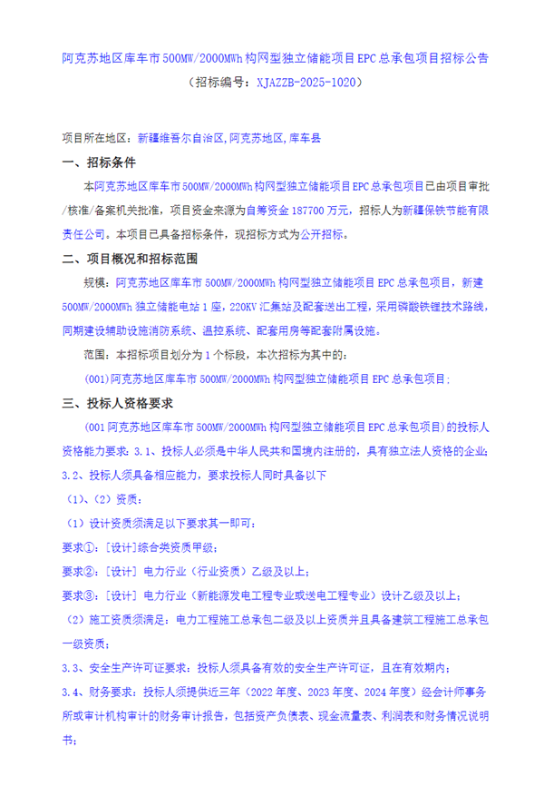 储能中国网获悉,10月24日,新疆保铁节能有限责任公司发布阿克苏地区库车市500MW/2000MWh构网型独立储能项目EPC总承包项目招标公告。项目位于新疆维吾尔自治区阿克苏地区库车县,项目资金来源为自筹资金187700万元,折合单价约为0.9385元/Wh。 该项目新建独立储能电站1座,220KV汇集站及配套送出工程,采用磷酸铁锂技术路线同期建设辅助设施消防系统、温控系统、配套用房等配套附属设施。该项目采用磷酸铁锂技术路线同期建设辅助设施消防系统、温控系统、配套用房等配套附属设施。总工期计划2026年6月30日前完成。 要求投标人近三年已完成的单体容量大于等于50兆瓦的电力建设工程的业绩不得少于2项。本项目允许联合体投标。 原文如下: