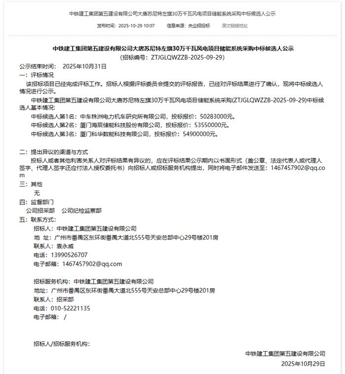 储能中国网获悉,10月29日,中铁建工集团第五建设有限公司大唐苏尼特左旗30万千瓦风电项目储能系统采购中标候选人公示。根据公示,中车株洲电力机车研究所有限公司以投标报价50283000元预中标。 中标候选人情况为, 中标候选人第1名:中车株洲电力机车研究所有限公司,投标报价:50283000元。 中标候选人第2名:厦门海辰储能科技股份有限公司,投标报价:53550000元。 中标候选人第3名:厦门科华数能科技有限公司,投标报价:54900000元。 招标公告表示,投标人近三年在中国境内具有累计不低于1GWh磷酸铁锂电池储能系统集成业绩,其中须具有两个单体项目容量为100MWh及以上的磷酸铁锂电化学储能系统集成设备(至少包含电池室/舱、BMS、PCS)的投运业绩。 中标候选人公示原文如下: