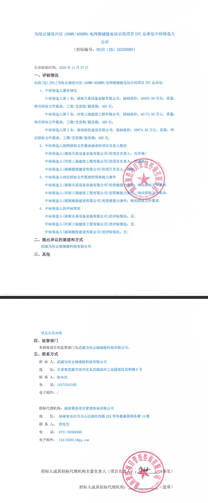 储能中国网获悉,近日,为恒云储凉州区100MW/400MWh电网侧储能电站示范项目EPC总承包中标候选人公示。 中标候选情况见下 第一中标候选人:湖南天禹设备安装有限公司,投标报价40000.00万元,折合单价1元/Wh; 第二中标候选人:河南三端建筑工程有限公司,投标报价46170.00万元,折合单价1.1543元/Wh; 第三中标候选人:湖南睦胜建设有限公司,投标报价39874.56万元,折合单价0.9969/Wh。 根据招标公告,项目招标人为武威为恒云储储能科技有限公司,项目位于甘肃省武威市凉州区,储能电站规划容量200MW/800MWh,本期建设100MW/400MWWh共享储能电站1座,占地面积80亩。主要建设综合办公楼1座、110kV升压站、电池集装箱、PCS 集装箱、高低压开关柜等。 原公告如下: