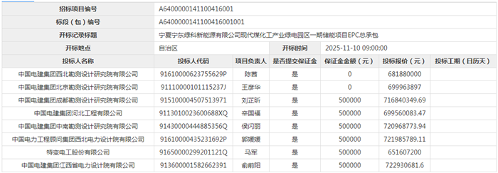 储能中国网获悉,11月10日,宁夏宁东绿科新能源有限公司现代煤化工产业绿电园区一期储能项目EPC开标。 本次共有8家企业参与投标,投标单价范围在0.543元-0.6024元/Wh,整体平均报价为0.585元/Wh。 根据此前发布的招标公告,该储能电站规模300MW/1200MWh,要求每个电池舱容量不小于6.25MWh。 投标人应根据本合同和适用法律的规定负责采购本项目的所有设备和材料,包括但不限于:储能电站(300MW/1200MWh,每个电池舱容量不小于6.25MWh)一次、二次设备采购(根据绿松330kV升压站接入相关要求完成该间隔一次设备和二次设备的采购):PCS、BMS、EMS、升压变舱、电池舱、开关柜、站用电源等;控制设备:包括储能系统;通信设备:包括站内通信设备、与调度及上送国家电网控制后台通信设备等;消防设备:包括预制舱等构筑物的消防设施等;智能设备:智能安防系统、智慧运维系统拓展、视频监控系统、火灾自动探测报警及消防控制系统等;测量设备:各种测量仪表、传感器等;电缆:包括电力电缆、控制电缆等;保护及自动化设备:五防系统、AGC控制装置等;站用电系统设备:包括交直流配电系统等; 投标人必须具备储能系统集成能力,应具备PCS、BMS、EMS集成能力,且具备其中至少一项的自主研发生产能力,且储能系统集成近两年累计供货业绩1GWh及以上。 原文如下:
