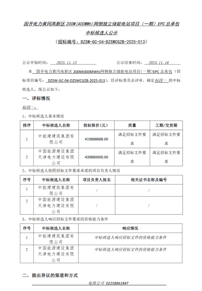 储能中国网获悉,近日,国开电力发布黄冈高新区200MW/400MWh网侧独立储能电站项目(一期)EPC总承包中标候选人公示。 中标候选情况为, 第一中标候选人:中能建建筑集团有限公司,投标报价为41988.89万元,折合单价为1.0497元/Wh; 第二中标候选人:中国能源建设集团天津电力建设有限公司,投标报价为43988万元,折合单价为1.0997元/Wh。 原文如下: