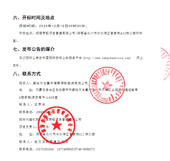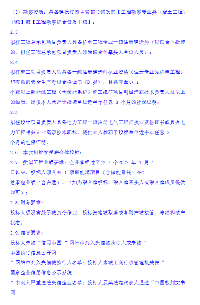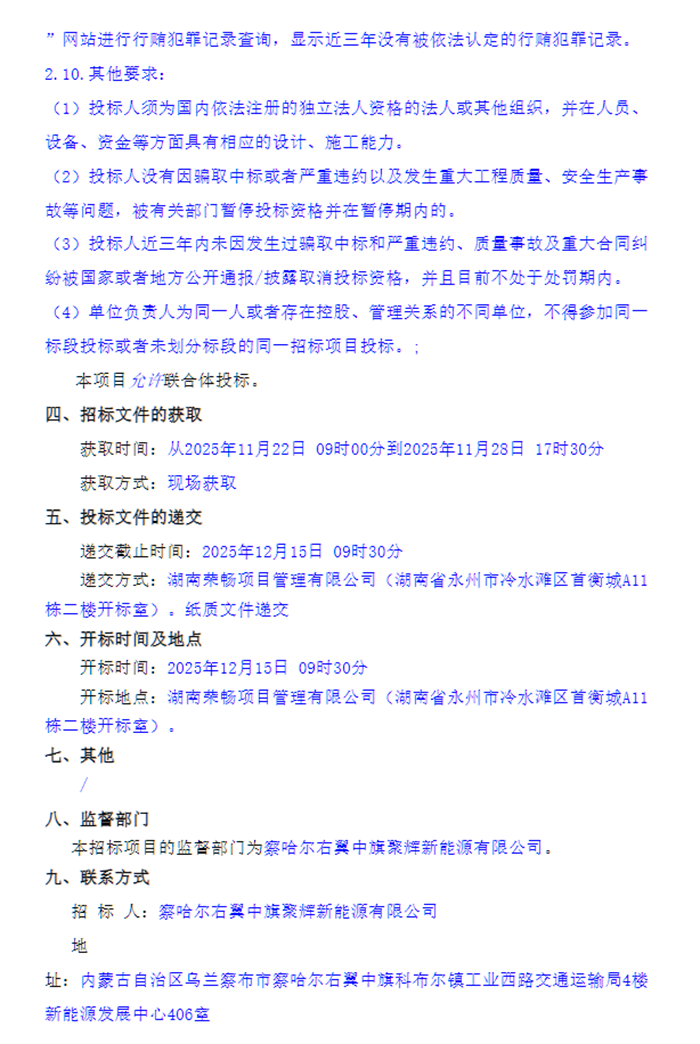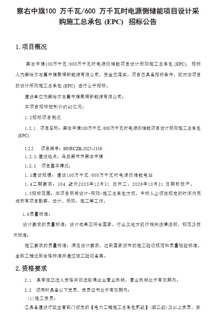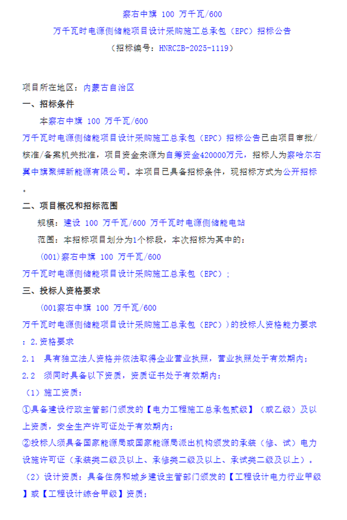 储能中国网获悉,11月21日,察哈尔右翼中旗聚辉新能源有限公司发布察右中旗100万千瓦/600万千瓦时电源侧储能项目设计采购施工总承包(EPC)招标公告。项目资金来源为自筹资金420000万元,招标人为察哈尔右翼中旗聚辉新能源有限公司。 根据招标公告,建设地点为乌兰察布市察右中旗。建设100万千瓦/600万千瓦时电源侧储能电站。其中,公告表示,中标人必须在规定的时间内完成所有项目勘察、设计、采购、施工等工作。 原文如下: