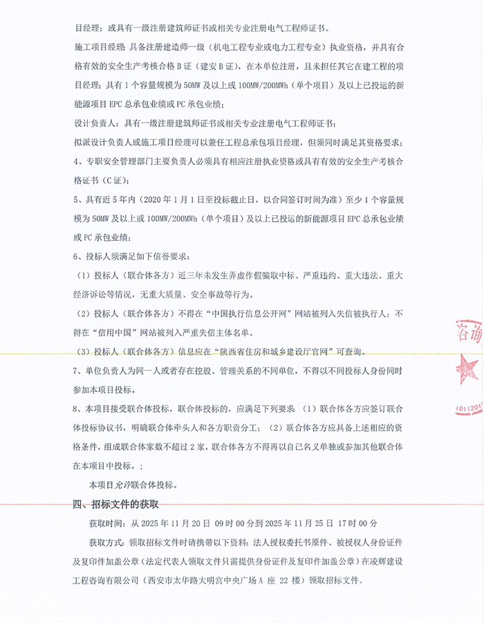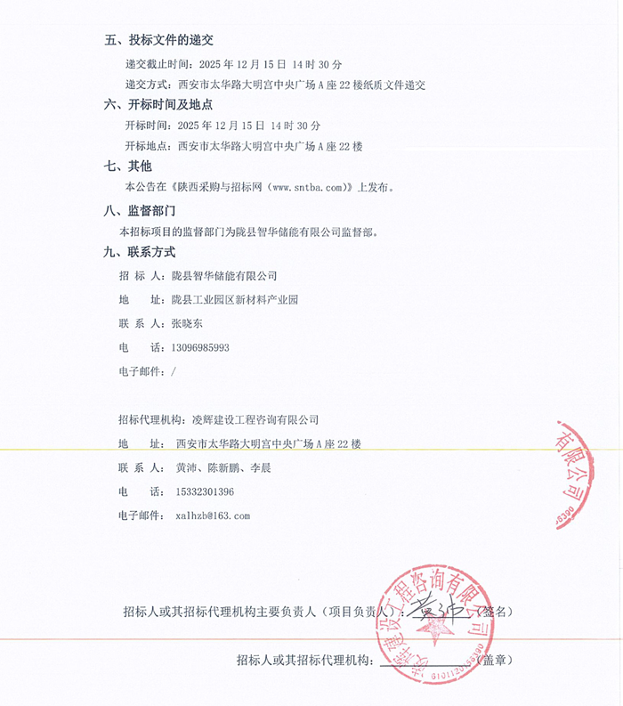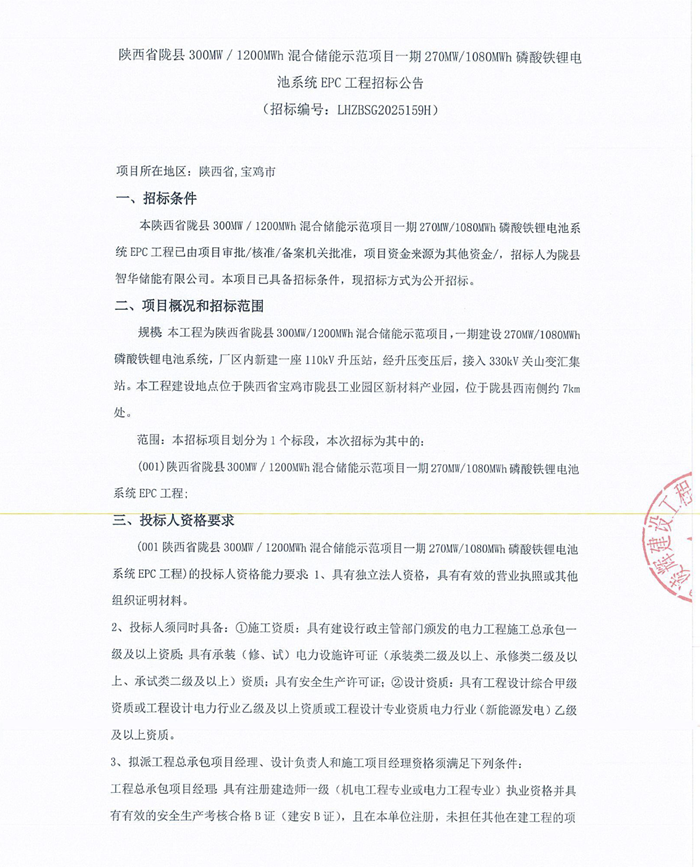 储能中国网获悉,近日,陇县智华储能有限公司发布陕西省陇县300MW/1200MWh混合储能示范项目一期270MW/1080MWh磷酸铁锂电池系统EPC工程招标公告。 项目位于陕西省宝鸡市陇县工业园区新材料产业园,位于陇县西南侧约7km处。本工程为300MW/1200MWh混合储能示范项目,一期建设270MW/1080MWh磷酸铁锂铁锂电池系统,厂区内新建一座110kV升压站,经升压变压后,接入330kV关山变汇集站。 招标范围:本次招标的为陕西省陇县300MW/1200MWh混合储能示范项目一期270MW/1080MWh磷酸铁锂电池系统EPC工程。 投标人业绩要求:具有近5年内(2020年1月1日至投标截止日,以合同签订时间为准)至少1个容量规模为50MW及以上或100MW/200MWh(单个项目)及以上已投运的新能源项目EPC总承包业绩或PC承包业绩。 原文如下: