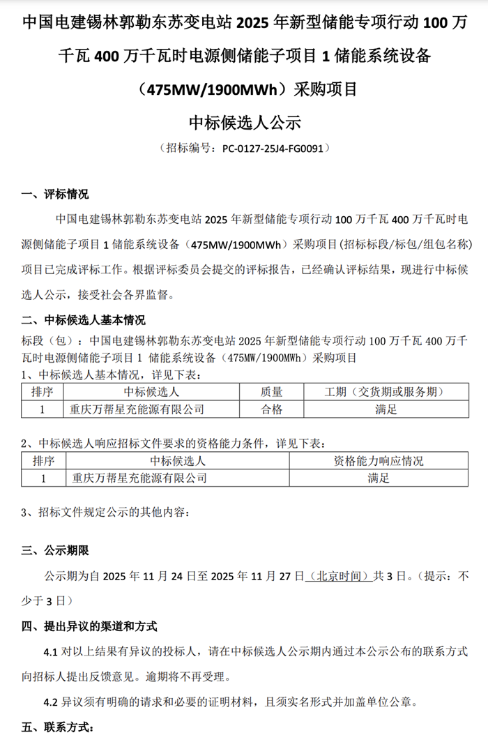 储能中国网获悉,11月24日,中国电建集团江西省电力建设有限公司发布内蒙古锡林郭勒东苏变电站2025年新型储能专项行动1GW/4GWh电源侧储能子项目储能系统设备中标候选人公示。项目包含两个储能系统设备采购,其中1储能系统设备(475MW/1900MWh)、2储能系统设备(25MW/100MWh),子项目总规模500MW/2GWh。中标候选人分别为重庆万帮星充能源有限公司和山西尧兴新能源科技有限公司,分别预中标475MW/1900MWh、25MW/100MWh储能系统设备。 根据招标公告,项目为集中式构网型储能电站,采用磷酸铁锂电池,规划装机容量为500MW/2000MWh,总用地面积约为220亩,预计总投资约17亿元,一次性完成项目征地及储能电站本体、升压站、外送线路建设。 中标候选人公示原文如下: