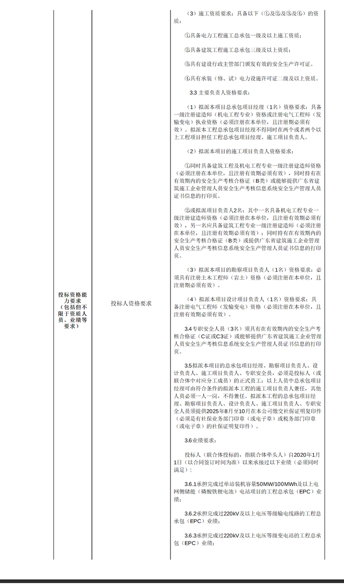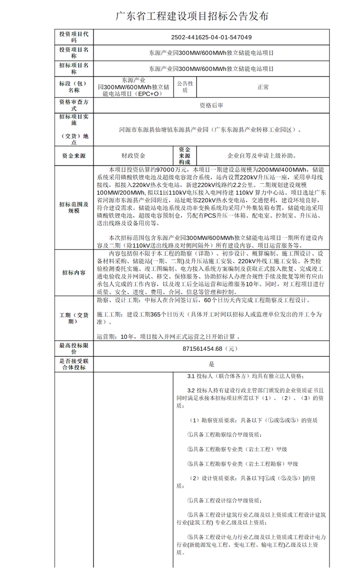 2025年11月22日,东方之源(东源)能源有限公司发布东源产业园300MW/600MWh独立储能电站项目招标公告,投资约97000万元, 最高投标限价871561454.68元,约合单价1.45元/Wh。资金来源为财政资金,企业自筹及申请上级补助。总工期为425个日历天。 据了解,招标人东方之源(东源)能源有限公司为东源县国有资产投资集团有限公司子公司。 本项目一期建设总规模为200MW/400MWh,储能系统采用磷酸铁锂电池及超级电容混合系统,站内设置220kV升压站一座,采用单线接线,拟接入220kV热水变电站,新建220kV线路约2.2公里。二期规划建设规模100MW/200MWh,拟以1回110kV电压接入电网待建 110kV 算力中心站。 项目要求投标人承担完成过单站装机容量50MW/100MWh及以上电网侧储能(磷酸铁锂电池)电站项目的工程总承包(EPC)业绩;承担完成过220kV及以上电压等级输电线路的工程总承包(EPC)业绩;承担完成过220kv及以上电压等级变电站的工程总承包(EPC)业绩。 本招标项目接受联合体投标。 原文如下:
