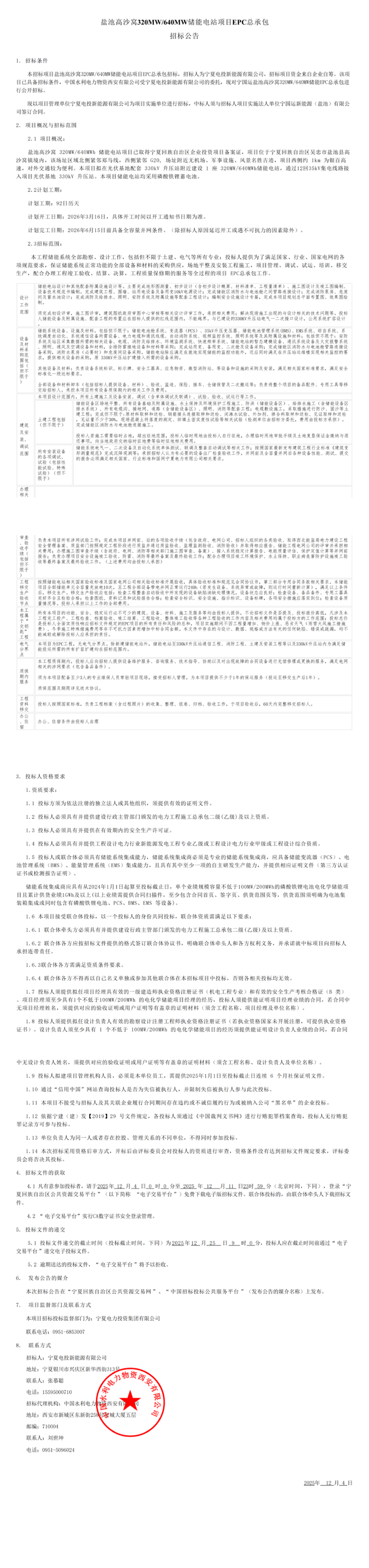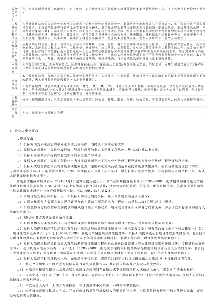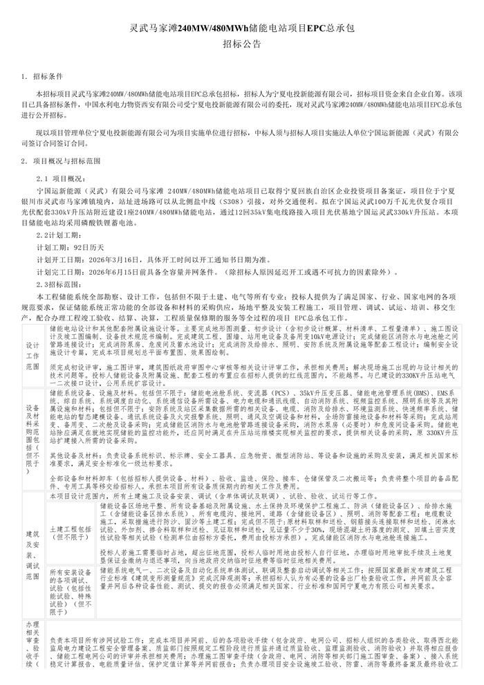 储能中国网获悉,近日,宁夏电投发布宁夏盐池高沙窝320MW/640MWh储能电站、宁夏灵武马家滩240MW/480MWh储能电站项目EPC总包招标公告。两个项目总规模560MW/1120MWh。 其中,宁夏盐池高沙窝320MW/640MWh储能电站项目 本项目拟在光伏基地配套330kY升压站附近建设1座 320NW/640MWh储能电站,通过12同35kV集电线路接入项目光伏基地330kV升压站。本项目储能电站均采用磷酸铁锂蓄电池。 招标范围:本工程储能系统全部勘察、设计工作,包括但不限于土建、电气等所有专业;储能系统全部设备和材料的采购供应,场地平整及安装工程施工,项目管理、调试、试运、培训、移交生产,配合办理工程竣工验收、结算、决算,工程质量保修期的服务等全过程的项目EPC总承包工作。 设备采购包括:储能系统设备、设施及材料。包括但不限于:储能电池舱系统、变流器(PCS)、35kV升压变压器、储能电池管理系统(BMS)、EMS系统、综自系统、系统调度自动化、系统通信设备所需设备、电力电缆和通讯线缆、自动消防系统、视频监控系统、照明系统等及其附属设施和材料等。 宁夏灵武马家滩240MW/480MWh储能电站项目, 项目概况:宁国运新能源(灵武)有限公司马家滩240MW/480MWh储能电站项目已取得宁夏回族自治区企业投资项目备案证,项目位于宁夏银川市灵武市马家滩镇境内,站址进场路可以从北侧盐中线(S308)引接,对外交通便利。拟在宁国运灵武100万千瓦光伏复合项目光伏配套330kV升压站附近建设1座240MW/480MWh储能电站,通过12回35kV集电线路接入项目光伏基地宁国运灵武330kV升压站。本项目储能电站均采用磷酸铁锂蓄电池。 招标范围:本工程储能系统全部勘察、设计工作,包括但不限于土建、电气等所有专业;投标人提供为了满足国家、行业、国家电网的各项规范要求,保证储能系统正常功能的全部设备和材料的采购供应,场地平整及安装工程施工,项目管理、调试、试运、培训、移交生产,配合办理工程竣工验收、结算、决算,工程质量保修期的服务等全过程的项目EPC总承包工作。 原文如下: |