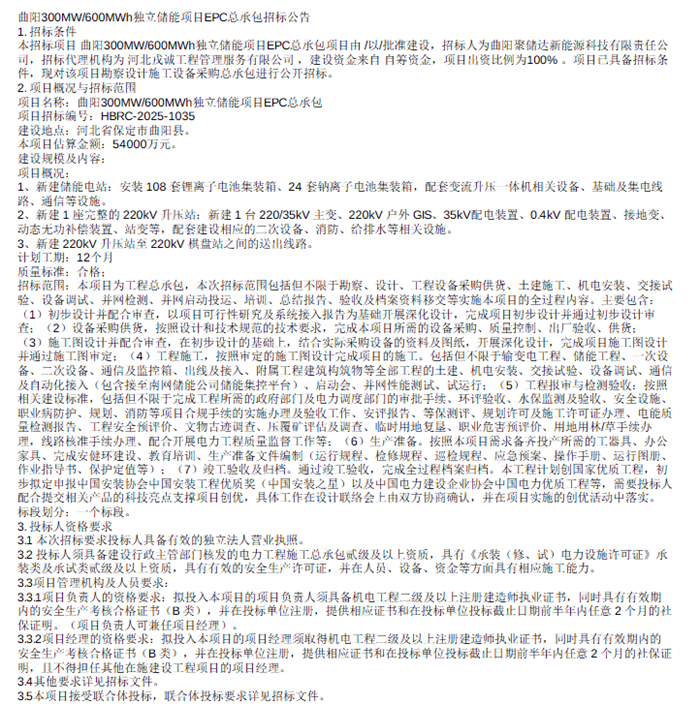 2025年12月12日,曲阳300MW600MWh独立储能项目EPC总承包招标公告发布。该项目招标人为曲阳聚储达新能源科技有限责任公司,招标代理机构为河北诚工程管理服务有限公司,建设地点位于河北省保定市曲阳县,本项目估算金额为54000 万元,单价为0.9元/Wh。 新建储能电站:安装108套锂离子电池集装箱、24套钠离子电池集装箱,配套变流升压一体机相关设备、基础及集电线路、通信等设施。 新建1座完整的 220kV 升压站:配套1台220/35kV主变、220kV 户外GIS、35kV 配电装置、0.4kV配电装置、接地变、动态无功补偿装置等。另,配套建设相应的二次设备、消防、给排水等相关设施。新建 220kV 升压站至 220kV 棋盘站之间的送出线路。计划工期为12个月,质量计划为合格。 该招标范围为本项目为工程总承包,本次招标范围包括但不限于勘察、设计、工程设备采购供货、土建施工、机电安装、交接试验、设备调试、并网检测、并网启动运行、总结、报告结、验收及档案资料移交等实施本项目的全过程内容。 本项目接受联合体投标。 原公告如下: