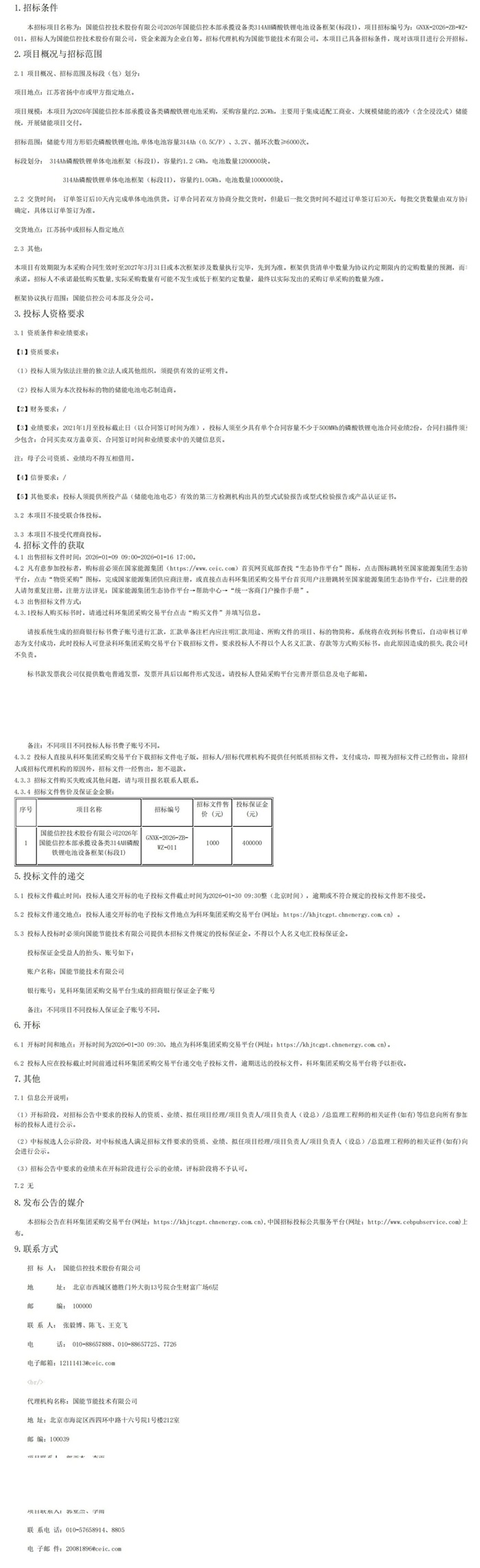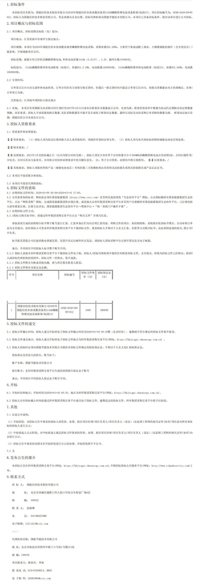 国能信控技术股份有限公司2026年国能信控本部承揽设备类314AH磷酸铁锂电池设备框架(标段II)招标公告