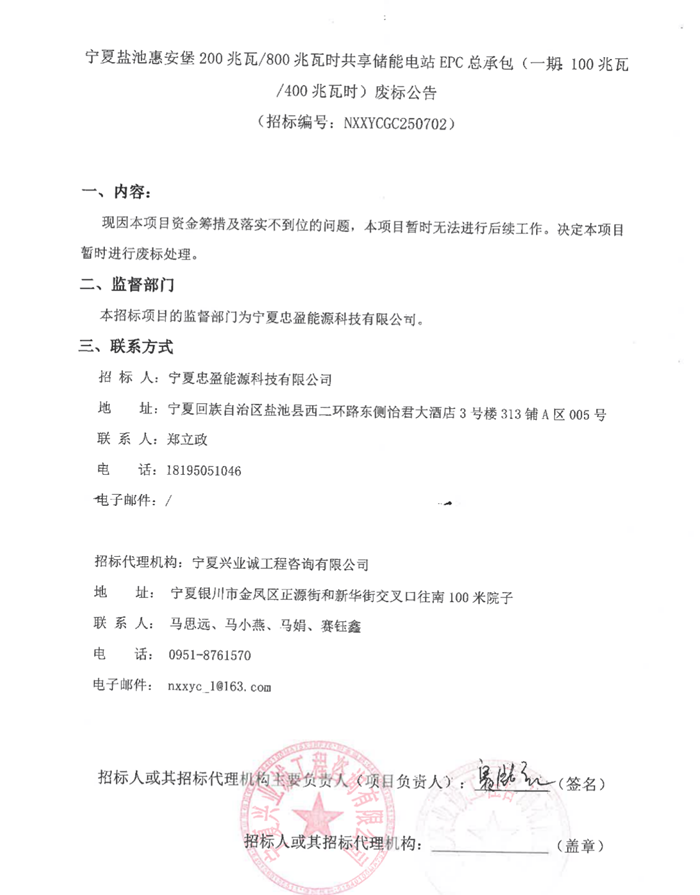 储能中国网获悉,1月14日,宁夏盐池惠安堡200兆瓦/800兆瓦时共享储能电站EPC总承包(一期、二期)废标公告。公告显示,因项目资金筹措及落实不到位的问题,暂时无法进行后续工作。决定本项目暂时进行废标处理。 据了解,该项目中标人为均为中铁二十一局集团运营管理有限公司,投标报价均为43000万元,折合单价为1.075元/Wh。项目招标人为宁夏忠盈能源科技有限公司。 原文如下: