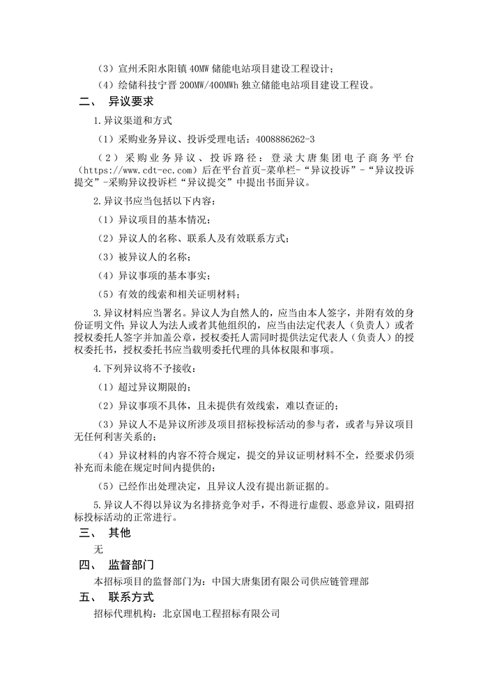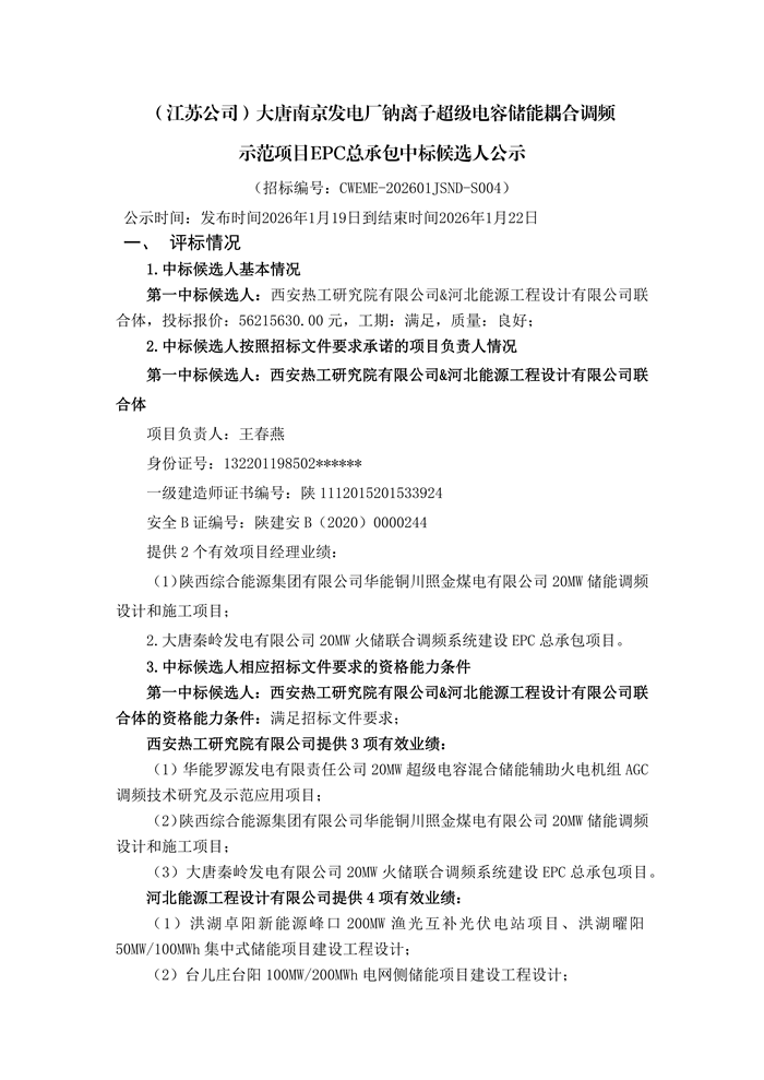 储能中国网获悉,日前,(江苏公司)大唐南京发电厂钠离子超级电容储能耦合调频示范项目EPC总承包中标候选人公示。西安热工研究院有限公司&河北能源工程设计有限公司联合体预中标。 根据招标公告,项目业主为大唐南京发电厂,(江苏公司)大唐南京发电厂钠离子超级电容储能耦合调频示范项目建设规模为1320MW。建设地点为江苏省南京市栖霞区龙潭街道马渡村电厂路 1 号。 招标范围:本项目范围为大唐南京发电厂新增储能调频系统项目设计、技术装备采购,包含设计、设备采购、土建、安装调试、试验等内容。 计划工期:进度要求合同签订后 180 天完成完成项目建设并接入电网 原文如下: