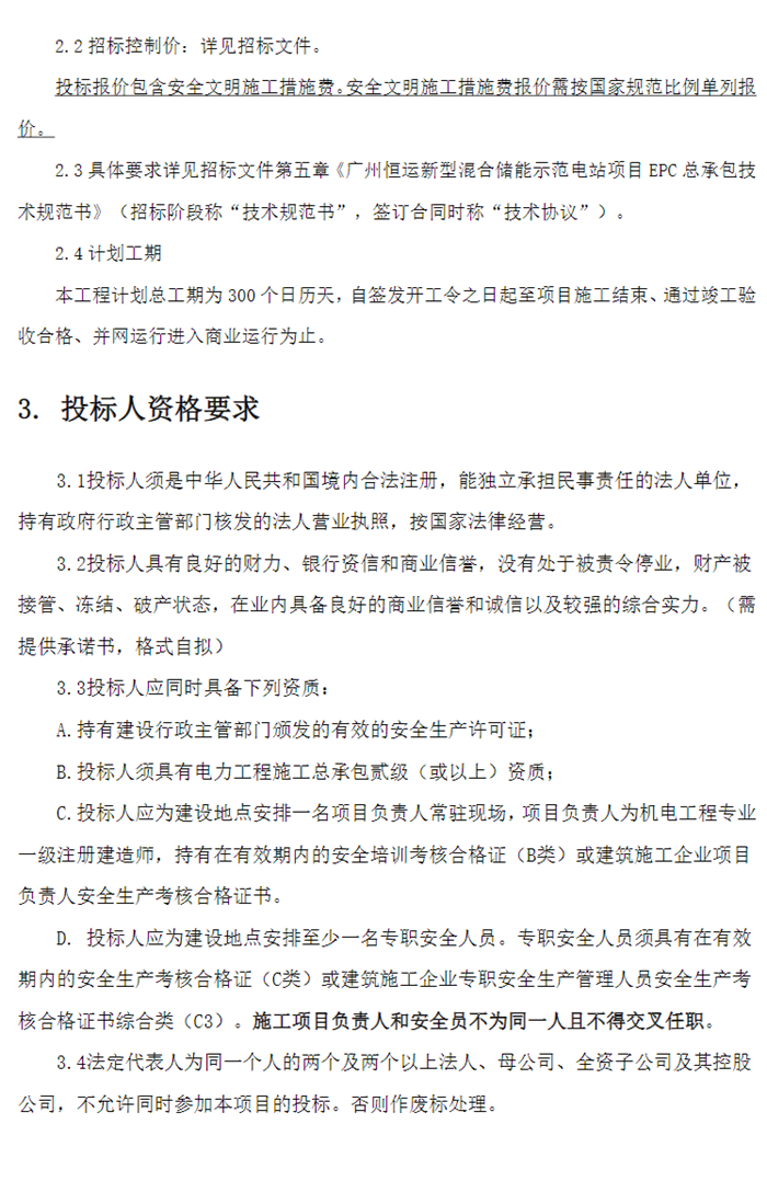 储能中国网获悉,2026年1月17日,广州恒运储能科技有限公司发布广州恒运新型混合储能示范电站项目EPC总承包招标公告,项目招标人为广州恒运储能科技有限公司,建设资金来自自筹,项目出资比例为100%,计划总工期为300个日历天。 该项目建设1座200MW/400MWh磷酸铁锂电池+5MW/0.5MWh(6min)超级电容新型混合示范储能电站,储能系统整体布局在场区南侧,储能升压站整体布局在场区西北侧。配套建设1座220kV储能升压站,建设一栋综合楼、一栋生产楼、35kV配电室和其他设施。 项目要求投标人近五年具有至少1项不低于100MW/200MWh独立储能总承包业绩,且系统集成(集成范围至少包含电池系统、BMS、PCS三者)累计规模不低于500MWh。 原文如下: |