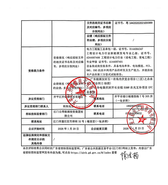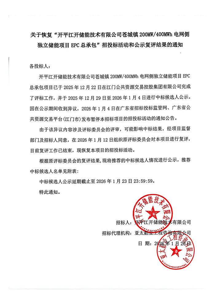 储能中国网获悉,1月20日,江门市公共资源交易平台发布关于恢复“开平江开储能技术有限公司苍城镇200MW/400MWh电网侧独立储能项目EPC总承包”招投标活动和公示复评结果的通知。公告显示,中标候选人由南网科技与中国电建昆明院联合体变更为中铁二十五局与南方新能院。 2025年12月1日,招标人开平江开储能技术有限公司发布200MW/400MWh的电网侧独立储能项目EPC招标。该项目位于广东省江门市苍城镇内的220kV湾琴变电站东南侧,配套建设220kV储能升压站1座。招标要求设备集成商至少具备电池单体、电池模组、PCS、BMS、EMS的其中两项产品的研发及生产能力,并提供相关产品的第三方型式试验报告。 该项目于2025年12月29日发布中标候选人公示: 第一名为南方电网电力科技股份有限公司及中国电建集团昆明勘测设计研究院有限公司联合体,投标报价为38292.631366万元, 第二名为中铁二十五局集团电务工程有限公司与南方电网新能设计研究院(广东)有限公司联合体,投标报价为39077.18652万元、 第三名为广东电网能源发展有限公司与广东华成电力能源股份有限公司联合体,投标报价为38486.117804万元。 因在公示期间收到异议,2026年1月4日发布暂停本招标项目的招投标活动公告。直至1月20日,招标人发布恢复招投标活动,并公示复评结果。 调整后的结果显示,第一中标候选人由“南方电网电力科技股份有限公司(主)、中国电建集团昆明勘测设计研究院有限公司”,现变更为“中铁二十五局集团电务工程有限公司(主)、南方电网新能设计研究院(广东)有限公司”,这也意味着此次招标的最终中标价格从之前的38292.631366万元变更为39077.18652万元,单价约0.9573元/Wh变为0.9269元/Wh。 原文如下: |