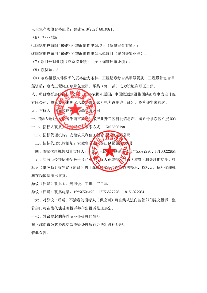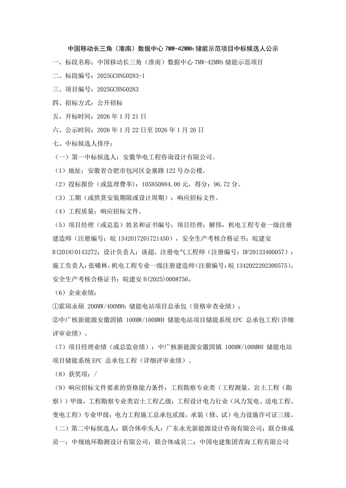 储能中国网获悉,1月22日,中国移动长三角(淮南)数据中心7MW-42MWh储能示范项目中标候选人公示。安徽华电工程咨询设计有限公司以投标报价1.0585亿元(折合单价约2.5203元/Wh)预中标。 中标候选人情况见下: 第一中标候选人:安徽华电工程咨询设计有限公司,投标报价105850884.00元,折合单价约2.5203元/Wh; 第二中标候选人:联合体牵头人:广东永光新能源设计咨询有限公司;联合体成员一:中规地环勘测设计有限公司;联合体成员二:中国电建集团青海工程有限公司,投标报价97502864.00元,折合单价约2.3215元/Wh; 第三中标候选人:山东电力工程咨询院有限公司,投标报价105362431.00元,折合单价约2.5086元/Wh。 根据招标公告,中国移动长三角(淮南)数据中心7MW-42MWh储能示范项目招标人为淮南皖能智慧能源有限公司,招标范围为主要工作内容(包括但不限于):7MW-42MWh全钒液流电池储能系统及场区场平(包含约4000平方储能应用场地及2000平方预留场地)、生产区、进站道路开口等设计,设备和材料采购、施工安装、整体系统调试、监控设备调试(满足皖能集团对场站监控的相关要求)、涉并网试验、消防验收、启动验收、并网、移交、外部协调、培训等。 本次项目招标合同估算价:107615379元,计划工期150日历天,从发包人发出书面通知之日起算。 中标候选人公示原文如下: