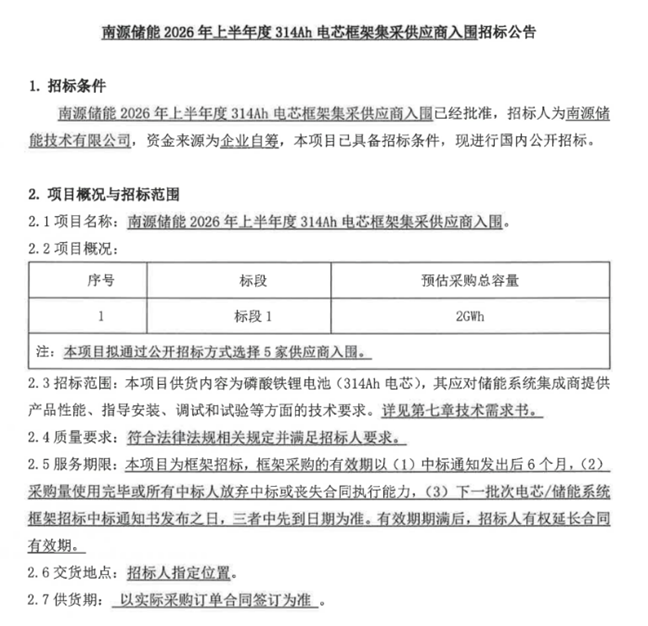 储能中国网获悉,2026年2月5日,南源储能发布2026年上半年度314Ah电芯框架集采供应商招标,拟采购一批磷酸铁锂电池(314Ah电芯),预估采购总容量2GWh。 据了解,招标人南源储能技术有限公司成立于2016年,是一家集碳酸锂、正极材料、铜箔、电芯、电池组研发、生产、销售于一体的研发型科技企业,专注于新能源电池上下游产业链。 本次集采要求投标人的单体储能电芯容量不小于314Ah一年内累计供货业绩不低于2GWh,其中需具备至少一个单个项目400MWh及以上的业绩。 本次集采不接受联合体投标。 原文如下: