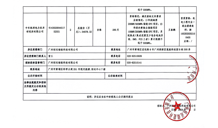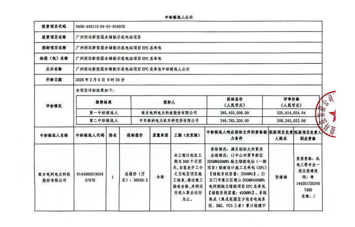 储能中国网获悉,2月7日,广州恒运新型混合储能示范电站项目EPC总承包中标候选人公示。根据公示,南方电网电力科技股份有限公司预中标。 中标候选人具体情况如下: 第一中标候选人:南方电网电力科技股份有限公司,投标报价36545.5万元(折合单价约0.9136元/Wh),评审价格约32561.4万元(折合单价约0.8140元/Wh); 第二中标候选人:中车株洲电力机车研究所有限公司,投标报价34678.32万元(折合单价约0.8670元/Wh),评审价格约30834.50万元(折合单价约0.7709元/Wh)。 注:招标公告显示,本项目最高投标限价36642.82万元(折合单价约0.916071元/Wh)。 根据招标公告,该项目建设规模为200MW/400MWh磷酸铁锂电池+5MW/6min超级电容,储能系统整体布局在场区南侧,储能升压站整体布局在场区西北侧。 本项目建设1座200MW/400MWh磷酸铁锂电池+5MW/0.5MWh(6min)超级电容新型混合示范储能电站,配套建设1座220kV储能升压站,建设一栋综合楼、一栋生产楼、35kV配电室和其他设施。 200MW/400MWh电化学储能电站共分为40套储能单元,每5套储能单元以“Π接”形式联接成1回储能馈线,40套储能单元共组合成8回储能馈线,接入储能升压站1台主变;超级电容单独1回馈线,接入储能升压站主变。升压站共设1台300MVA主变,主变升压至220kV后,以线变组形式通过1回220kV电缆送出线路送至220kV恒德站,实现储能并网。 项目位于广东省广州市黄埔区九佛街道知识城枫塱一路(原人才一路)与知明路交界处附近。站址西距知识大道约1.5km,北距广州北三环高速约4.7km,南距花莞高速约4.1km。再往西南800m处为220kV恒德变电站,东侧为在建工业园区,北侧市政路对面为广州孚能科技工业园区,南侧为荒地。站址用地性质为一类工业用地兼容二类工业用地。站址周边无公共敏感性建筑区域,现状主要为荒地,周边路网成熟,交通运输便利。 中标候选人公示原文如下: 来源:广州公共资源交易中心 |