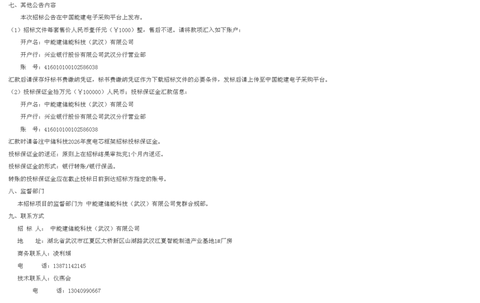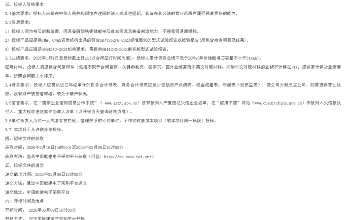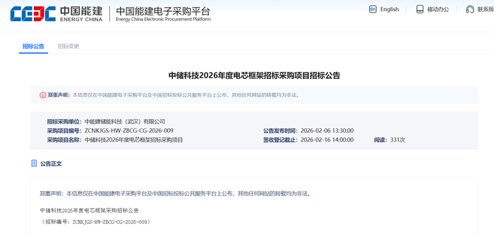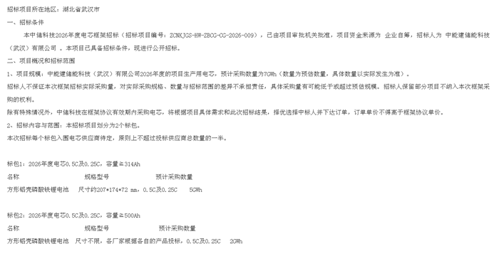 储能中国网获悉,2月6日,中储科技发布2026年度电芯框架招标采购项目招标公告。预计采购数量为7GWh,分为两个标包,其中, 标包1: 预计采购规模约5GWh,要求0.5C及0.25C且容量≧314Ah,尺寸约207*174*72mm; 标包2: 规模预计采购规模2GWh,要求倍率5C及0.25C,容量≧500Ah,但尺寸不限,各厂家根据各自的产品投标。 公示显示,招标采购单位为中能建储能科技(武汉)有限公司,此次招标不允许联合体投标。 招标公告原文如下: