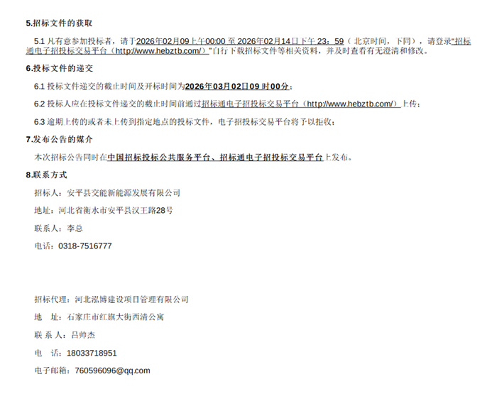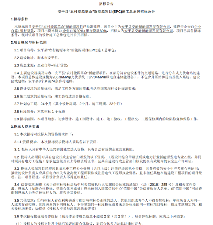储能中国网获悉,2026年2月8日,河北省安平县农村能源革命新能源项目EPC施工总承包招标公告发布。招标人为安平县交能新能源发展有限公司(安平县财政局旗下控股公司)。 该项目主要在部分符合建设条件的交通道路、进行分布式光伏电站的建设,总体建设规模为206.36MWp光伏系统(含704MWh绿电直连储能设备),不包含升压站和送出及接入系统。 招标范围包含勘察、初步设计、施工、竣工验收、工程移交、工程保修期内的缺陷修复和保修工作。 本次招标接受联合体投标,须满足相关条件。 招标公告原文如下: