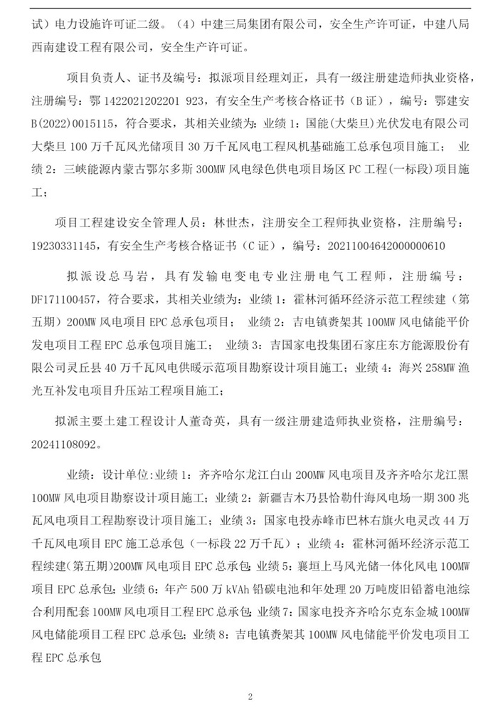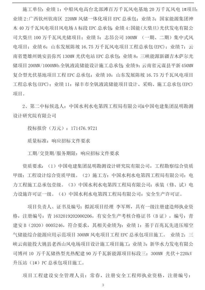 储能中国网获悉,2月9日,国家电力投资集团有限公司2025年度第68批集中招标(新疆能源化工巴州若羌50万千瓦风电场、220千伏升压站及5万千瓦/10万千瓦时储能电站EPC总承包工程)招标中标候选人公示。公示显示,中建三局集团有限公司&国核电力规划设计研究院有限公司&中建八局西南建设工程有限公司预中标! 中标候选人情况如下: 第一中标候选人:中建三局集团有限公司&国核电力规划设计研究院有限公司&中建八局西南建设工程有限公司,投标报价169950万元; 第二中标候选人:中国水利水电第四工程局有限公司&中国电建集团昆明勘测设计研究院有限公司,投标报价171476.9721万元。 根据招标公告,招标范围包括500MW风电场、50MW/100MWh储能电站、220kV升压站、2台调相机、35kV集电线路、进场道路、检修道路及附属设施等全部勘察设计工作。 原文如下:
