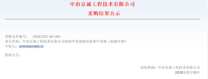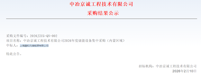 储能中国网获悉,2月10日,中冶京诚工程技术有限公司发布2026年度储能设备集中采购(内蒙古区域、新疆区域)结果公示。根据招标公告,本次集采规模共8GWh储能电池舱/磷酸铁锂电池,其中内蒙古5GWh,新疆3GWh。 集采结果具体如下: 内蒙古区域中标人:上海融和元储能源有限公司,中标规模5GWh; 新疆区域中标人:金风科技股份有限公司,中标规模3GWh。 采购结果公示原文: |