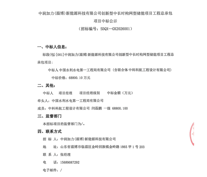 储能中国网获悉,2026年2月25日,中润加力(淄博)新能源科技有限公司创新型中长时构网型储能项目工程总承包项目中标公示。中标人为中国水利水电第一工程局有限公司(含联合体中科科航工程设计有限公司),中标价格:68800.10万元。 据悉,该项目位于山东省淄博市临淄区金岭回族镇纬六路9号,总用地面积约56亩,拟建设200MW/600MWh(磷酸铁锂储能系统)+3.5MW/6min(超级电容)创新型中长时构网型储能电站及附属设施,包括综合服务楼、地面防水设施及配套消防设施。 根据招标公告,项目招标人为中润加力(淄博)新能源科技有限公司,自筹资金70000万元。 招标范围:规从地址勘察、地形测量、初步设计、施工图设计、设备采购、保管、施工、安装调试、试运行、移交线路送出工程设计、设备材料采购、施工等,以及完成各项专项验收等全过程的全部工作,以最终满足招标人验收移交、正常运营的总承包工程,对总承包工程的质量、安全、进度、费用等全面负责,提供竣工验收相关支持、配合和服务等。 中标公示原文如下: