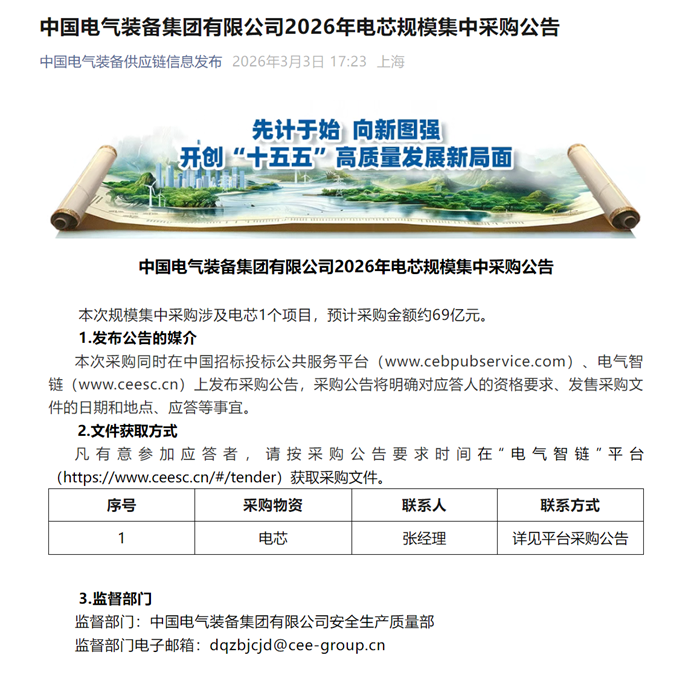 储能中国网获悉,3月3日,中国电气装备集团有限公司2026年电芯规模集中采购公告发布。此次规模集中采购涉及电芯1个项目,预计采购金额约69亿元。 根据公告,此次采购范围为磷酸铁锂电芯314Ah,预计采购19710000支,计算得总容量约为19.8GWh。