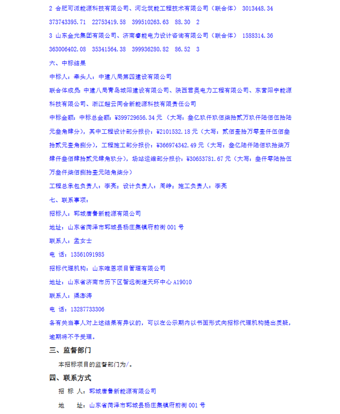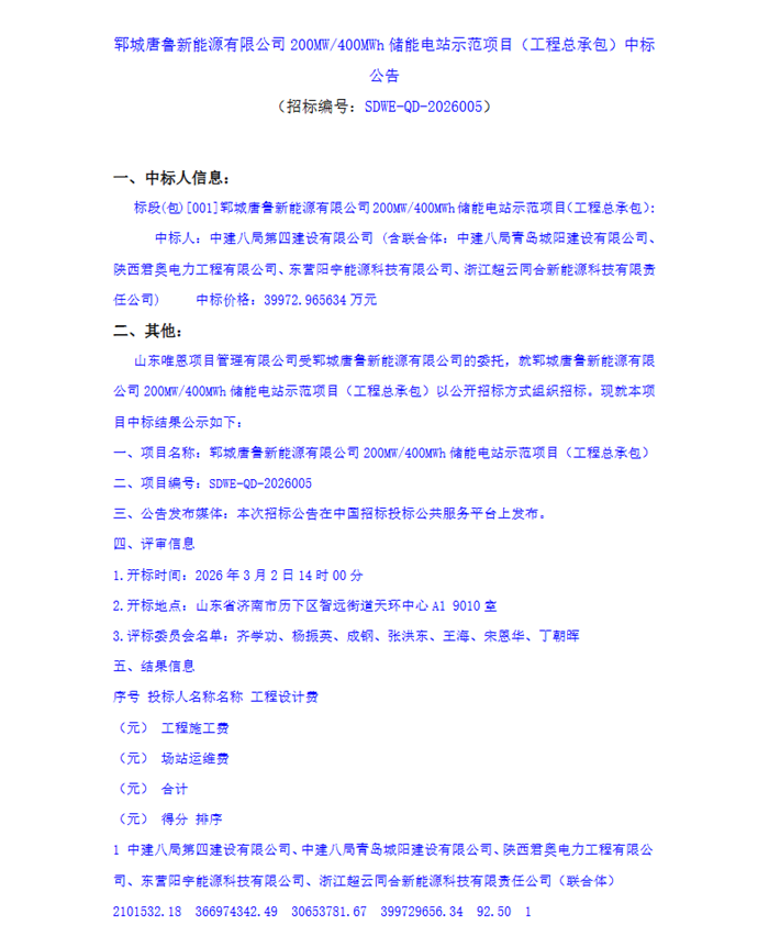 储能中国网获悉,2026年3月2日,山东菏泽郓城唐鲁新能源有限公司发布200MW/400MWh储能电站示范项目(工程总承包)中标公告。根据公告,中建八局第四建设有限公司(含联合体:中建八局青岛城阳建设有限公司、陕西君奥电力工程有限公司、东营阳宇能源科技有限公司、浙江超云同合新能源科技有限责任公司)以投标报价3.997亿元(折合单价约0.9993元/Wh)中标。 根据招标公告,该项目位于菏泽市郓城县丁里长街道张武屯村西北处,规划建设一座独立电化学储能电站,备案容量为200MW/400MWh,拟采用磷酸铁锂电池储能系统,除升压站区域,储能设备采用预制舱式模块化安装。 中标公告原文如下: