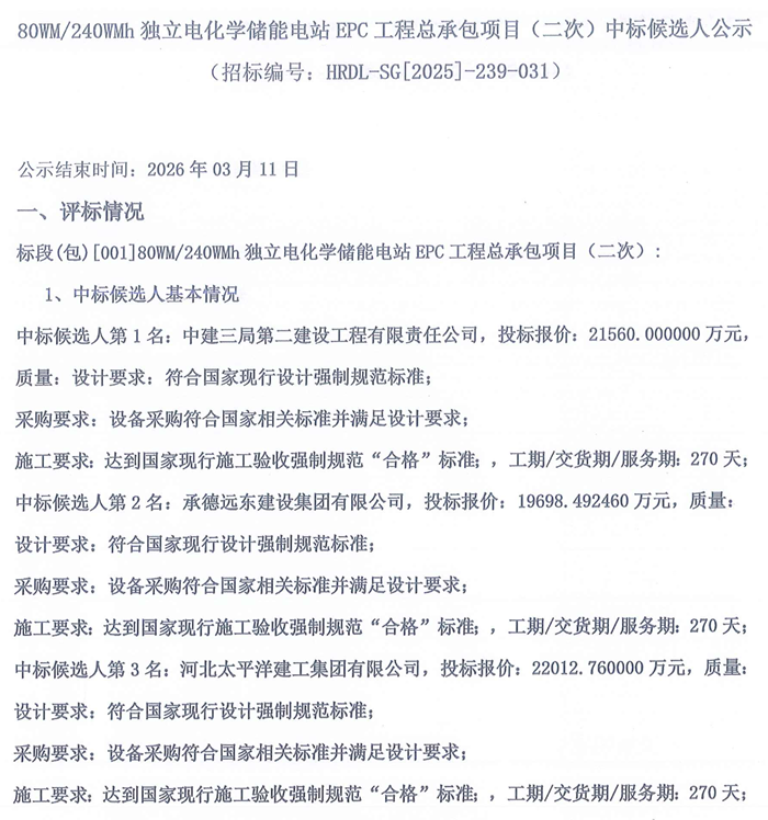 储能中国网获悉,3月9日,陕西省铜川市印台区80MW/240MWh独立电化学储能电站EPC工程总承包项目(二次)中标候选人公示。根据公示,中建三局第二建设工程有限责任公司以投标报价21560.00万元预中标。 中标候选人情况如下: 第一中标候选人,中建三局第二建设工程有限责任公司,投标报价21560.00万元,折合单价约0.8983元/Wh; 第二中标候选人,承德远东建设集团,投标报价19698.492460万元,折合单价约0.8208元/Wh; 第三中标候选人,河北太平洋建工集团,投标报价22012.76万元,折合单价约0.9172元/Wh; 原文如下: