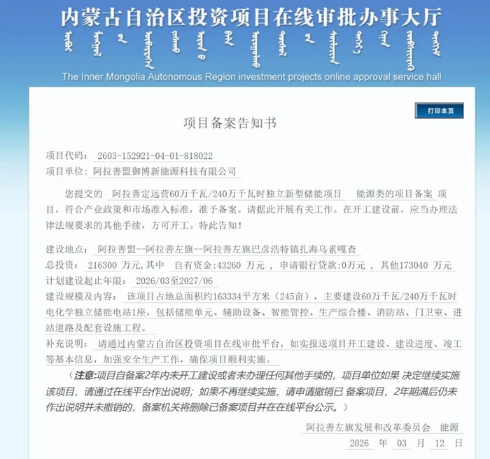 项目信息显示,该项目位于阿拉善盟阿拉善左旗巴彦浩特镇扎海乌素嘎查,总投资21.63亿元。项目占地总面积约163334平方米(245亩),主要建设600MW/2400MWh电化学独立储能电站1座,包括储能单元、辅助设备、智能管控、生产综合楼、消防站、门卫室、进站道路及配套设施工程。计划建设起止年限为2026年3月至2027年6月。 项目备案告知书如下: