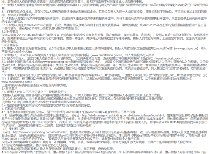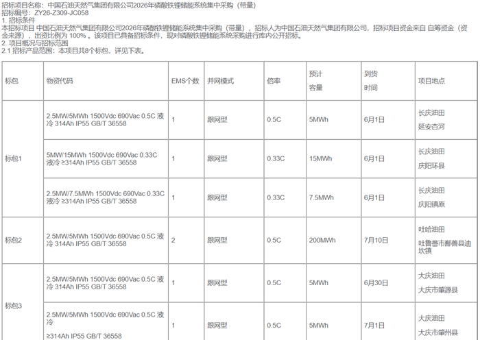储能中国网获悉,3月17日,中国石油天然气集团有限公司发布2026年磷酸铁锂储能系统集中采购(带量)招标公告,招标人为中国石油天然气集团有限公司,招标项目资金来自 自筹资金(资金来源),出资比例为 100% 。该项目已具备招标条件,现对磷酸铁锂储能系统采购进行库内公开招标。 招标公告表示,项目共8个标包,共计772.5MWh,要求电芯≧314Ah,电池舱≧5MWh。其中2小时储能系统,采购规模为750MWh,3小时储能系统22.5MWh。 原文如下: