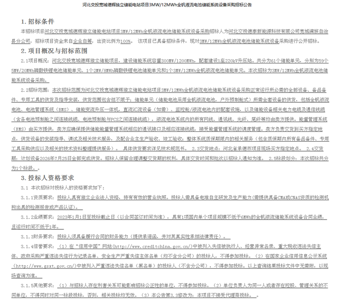 储能中国网获悉,河北交投宽城德辉独立储能电站项目发布297MW/1188MWh磷酸铁锂电池储能系统设备+3MW/12MWh全钒液流电池储能系统设备采购招标公告。项目招标人为河北交投德泰新能源科技有限公司宽城满族自治县分公司,招标项目资金来自企业自筹。 河北交投宽城德辉独立储能项目,建设储能系统容量300MW/1200MWh,配套建设1座220kV升压站。共分为61个储能单元,分别为59个5MW/20MWh磷酸铁锂电池储能单元、1个2MW/8MWh磷酸铁锂电池储能单元和1个3MW/12MWh全钒液流电池储能单元。 原文如下: