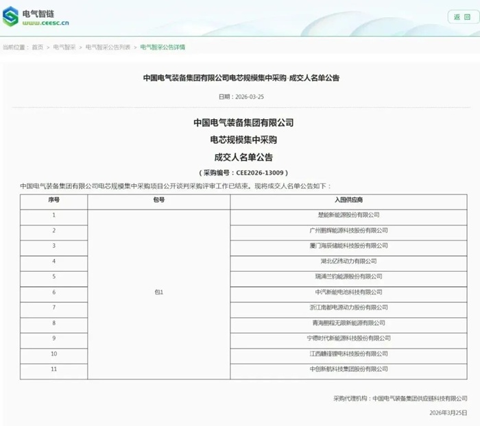 储能中国网获悉,3月25日,中国电气装备集团有限公司电芯规模集中采购成交人名单发布。公告显示,楚能新能源、鹏辉能源、海辰储能、亿纬动力、瑞浦兰钧、中汽新能、南都电源、青海鹏程无限、宁德时代、赣锋锂电、中创新航共11家供应商入围。据此前公告显示,314Ah磷酸铁锂电芯预计采购数量为1971万支,总容量约为19.8GWh。采购人为中国电气装备集团有限公司及下属单位。 原文如下: