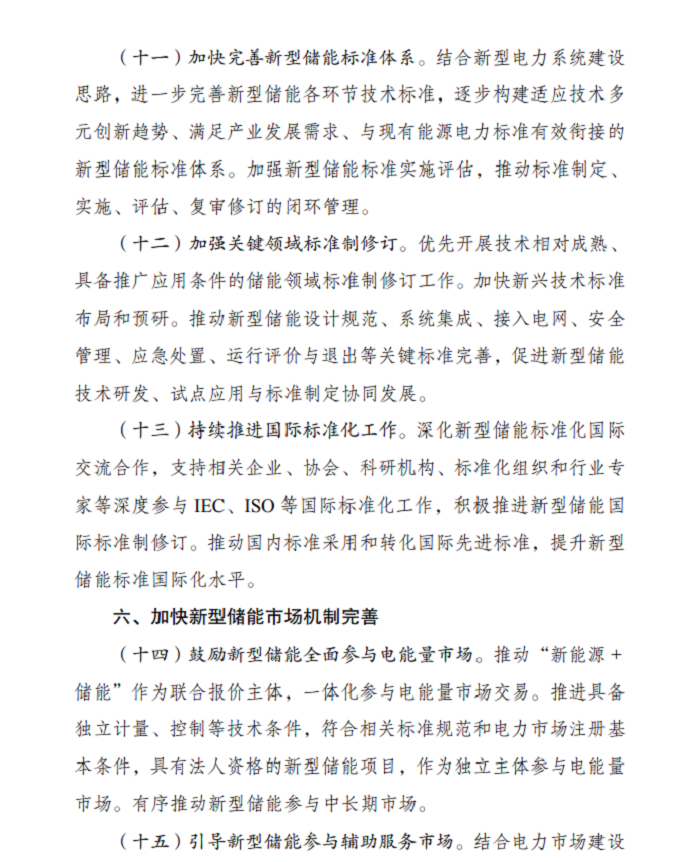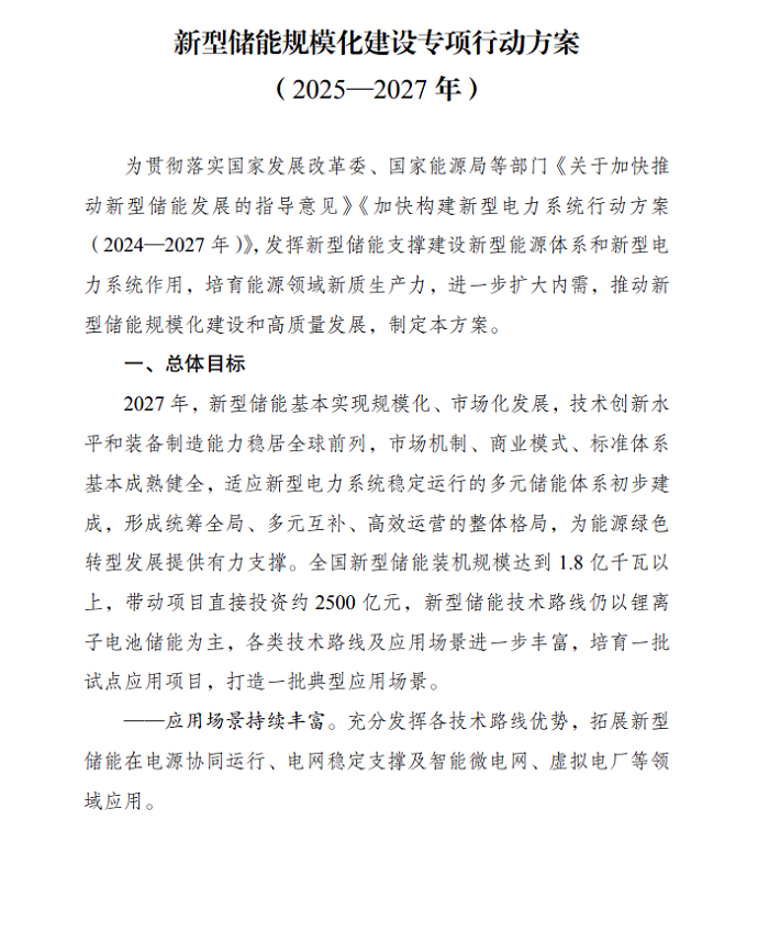 储能中国网获悉,9月12日,国家发展改革委、国家能源局发布关于印发《新型储能规模化建设专项行动方案(2025—2027年)》的通知。其中,方案提出,2027年,全国新型储能装机规模达到1.8亿千瓦以上,带动项目直接投资约2500亿元,各类技术路线及应用场景进一步丰富,培育一批试点应用项目,打造一批典型应用场景。 方案表示,鼓励新型储能全面参与电能量市场。推动“新能源+储能”作为联合报价主体,一体化参与电能量市场交易。推进具备独立计量、控制等技术条件,符合相关标准规范和电力市场注册基本条件,具有法人资格的新型储能项目,作为独立主体参与电能量市场。有序推动新型储能参与中长期市场。 引导新型储能参与辅助服务市场。结合电力市场建设进展,有序引导新型储能参与调频、备用等辅助服务市场,鼓励各地区因地制宜研究探索爬坡、转动惯量等辅助服务品种,逐步扩大新型储能参与辅助服务规模。 加快新型储能价格机制建设。推动完善新型储能等调节资源容量电价机制,有序建立可靠容量补偿机制,对电力系统可靠容量给予合理补偿。各地要加快推进电力中长期、现货市场建设,完善市场价格形成机制,推动合理形成新型储能充放电价格。 方案提出,推动沙漠、戈壁、荒漠等新能源基地合理规划建设新型储能。建设一批系统友好型新能源电站,促进新能源电站与配建新型储能联合运行,平滑新能源出力曲线,提高可靠出力水平,提供电网稳定支撑能力。研究煤电机组与电化学储能、飞轮储能、热储能等新型储能项目联合运行,优化运行方式提升调节能力。鼓励利用退役火电厂场地和送出线路,科学规划建设新型储能。 加快推进构网型储能在高比例新能源电网、弱电网及孤岛电网的示范应用,推广配电网新型储能应用,提升新型储能对电力系统稳定运行支持能力。鼓励在配电网扩建受限或偏远地区推广电网替代型储能。 聚焦工业园区、算力设施、商业综合体、光储充放一体化充电站、分布式光伏、通信基站等应用场景,积极创新绿电直连、虚拟电厂、智能微电网、源网荷储一体化车网互动等应用模式,进一步发挥系统调节作用。研究推广新型储能作为独立主体或通过负荷聚合商等形式参与需求响应。 各地重点围绕电源侧、电网侧及其他多场景应用方向,依托大数据、云计算、人工智能等前沿技术,创新“人工智能+”应用场景,培育一批技术领先、应用前景好可复制性强的新型储能应用场景。 原文如下: 国家发展改革委 国家能源局关于印发 《新型储能规模化建设专项行动方案 (2025—2027年)》的通知 发改能源〔2025〕1144号 各省、自治区、直辖市及新疆生产建设兵团发展改革委、能源局,北京市城市管理委,国家能源局各派出机构,有关中央企业: 为推动新型储能高质量发展,国家发展改革委、国家能源局研究制定了《新型储能规模化建设专项行动方案(2025—2027年)》。现予印发,请结合实际认真抓好贯彻落实。 国家发展改革委 国 家 能 源 局 2025年8月27日